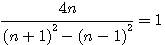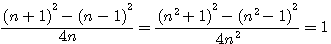 Notez que cette égalite ne représente pas un triangle rectangle entier , 4n n'étant pas un carré sauf si n=4 (ou une puissance de 4).avec une seule solution D'autre part si n=1 , 4 est aussi un carré mais le deuxieme terme (n-1)² est égal à 0. Si l'égalité demeure vraie 0 ne peux pas ètre un coté d'un triangle. (4 = 2² -0²)