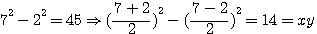 La différence de deux carrés x² et y² au carré implique que la (somme de leurs cotés /2)² - (leurs différence divisée / 2)² = le produit de ces deux nombres.